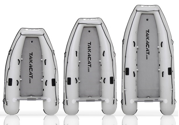 Gerade beim Einsatz von Elektroaußenbordern zahlt sich das geringe Gewicht und die geringe benetzte Fläche des Katamaran-Designs aus. Im Gegensatz zu standardmäßigen Schlauchbooten verbrauchen Takacats bis zu 50% weniger Energie und kommen sehr schnell mit extrem geringen Angleitwinkel ins Gleiten, weil das Boot kein Anfahren auf die Bugwelle durchführen muss.
