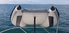 Der Speed-Tube wird im aufgeblasenen Zustand (3,6PSI), unter dem Verbindungsboden, zusammen mit den Ringen der Bugfixierung verzurrt und zusätzlich mit den beiden mitgelieferten Spanngurten an der unteren Transomstange, links- und rechtsseitig der Heckspiegelplatte, mittig fixiert.